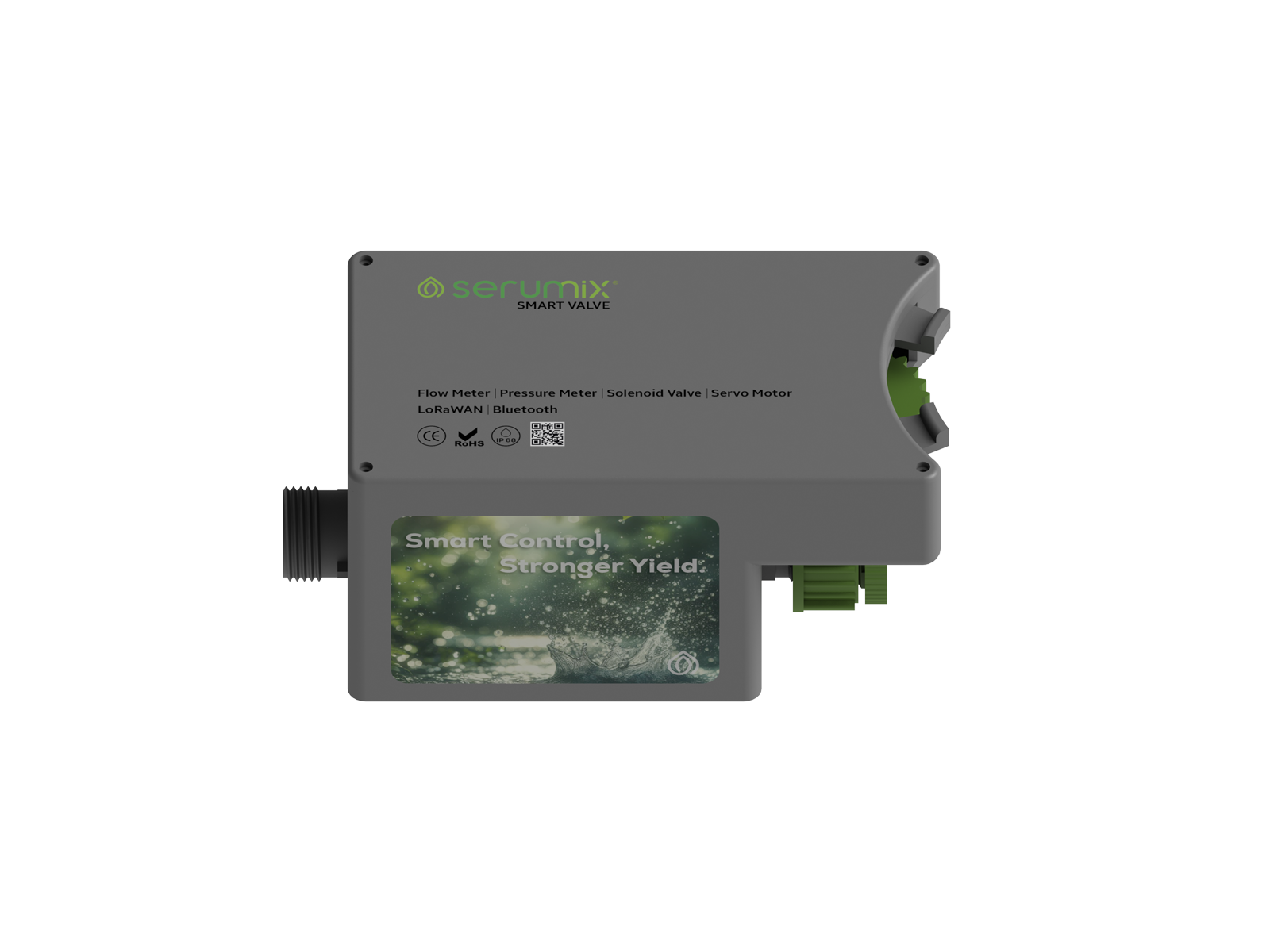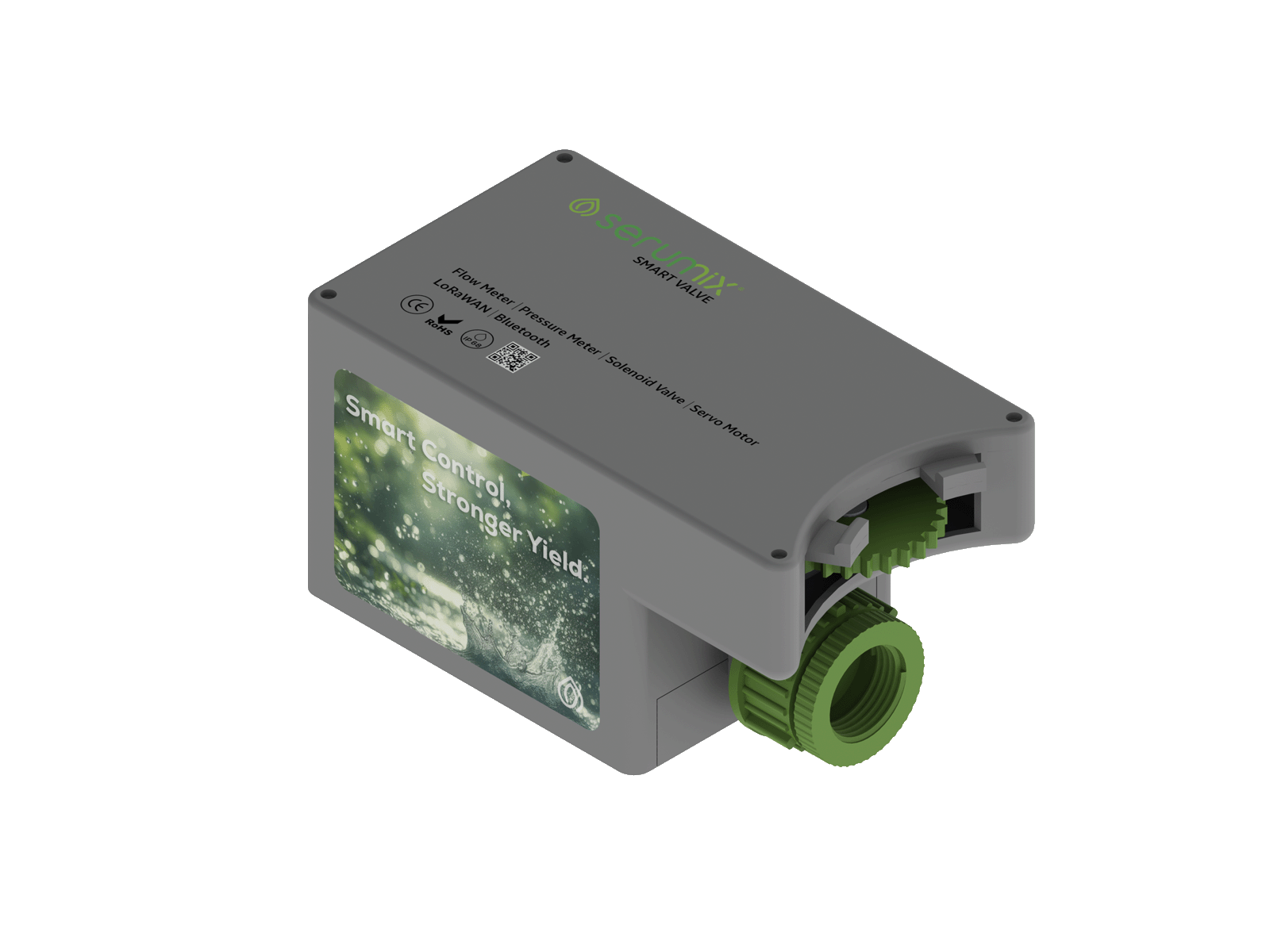 Debi sensörü, basınç sensörü, servo motor ve selenoid vana ile donatılmış akıllı vana, sulama hattı üzerinde tam kontrol sağlar.