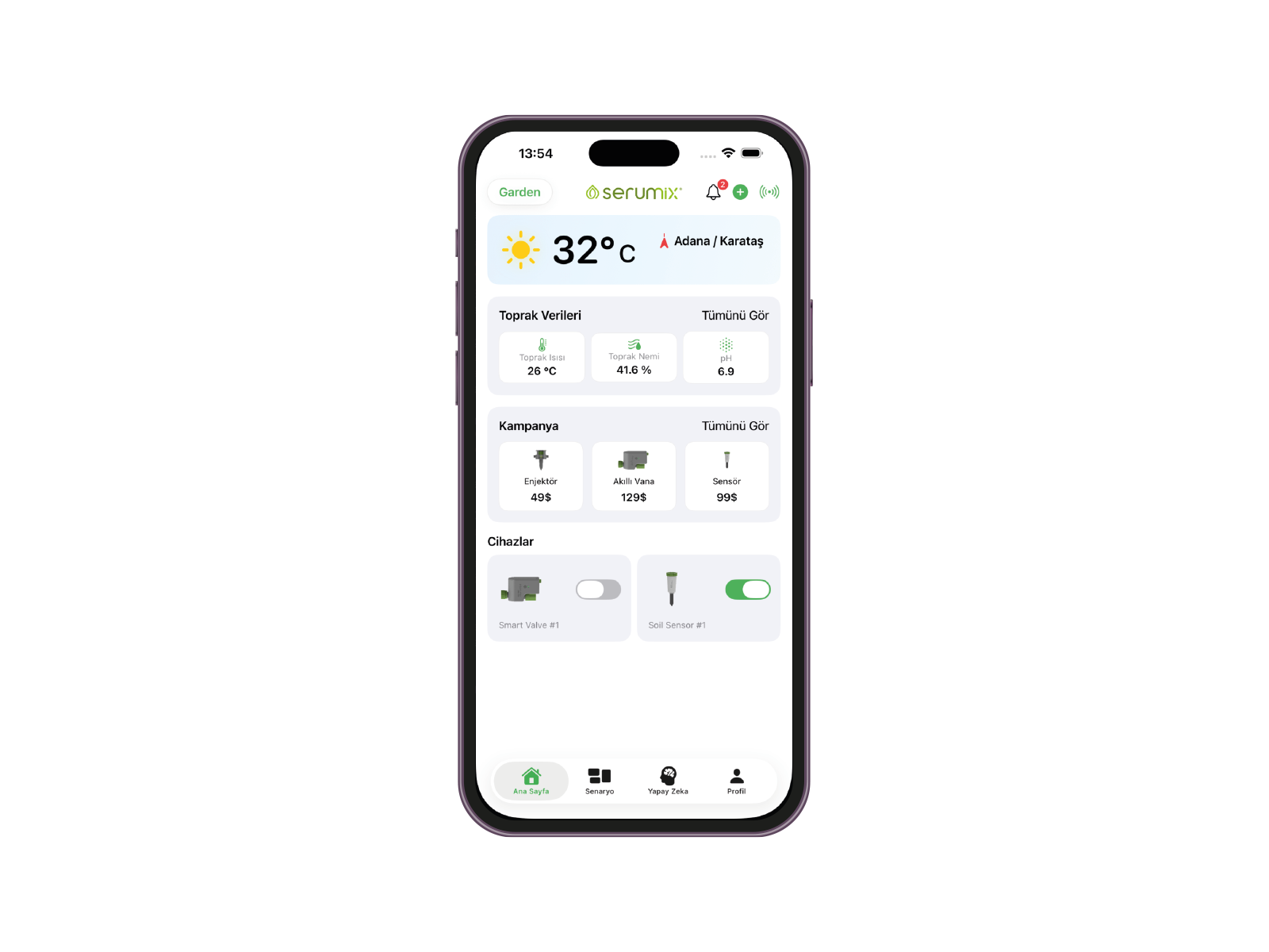 Serumix; toprak sensörleri, akıllı vana ve yapay zekâ ile sulama, gübreleme ve bitki sağlığını otomatik yöneten entegre bir tarım çözümüdür. Bitkinin ihtiyacını analiz eder, doğru zamanda ve doğru miktarda işlemi uygular.