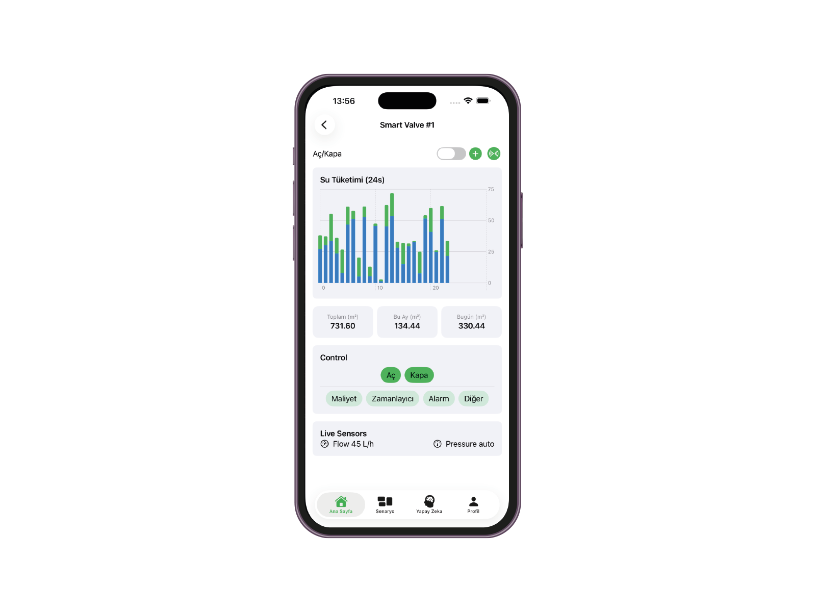 Sensör ve yapay zekâ verilerine göre sulama otomatik başlar veya durur. Bitki tam ihtiyacı kadar su alır, gereksiz tüketim engellenir.