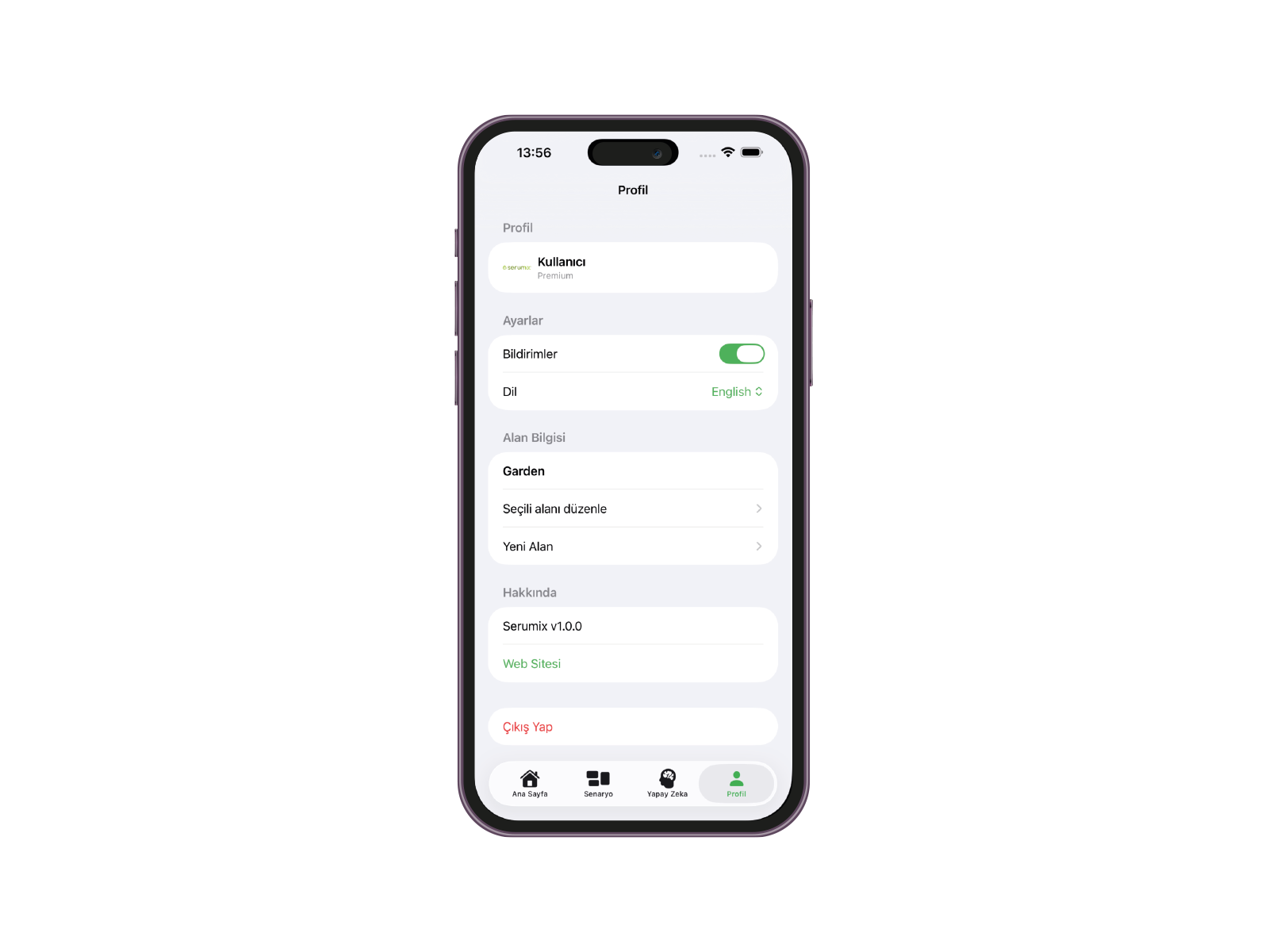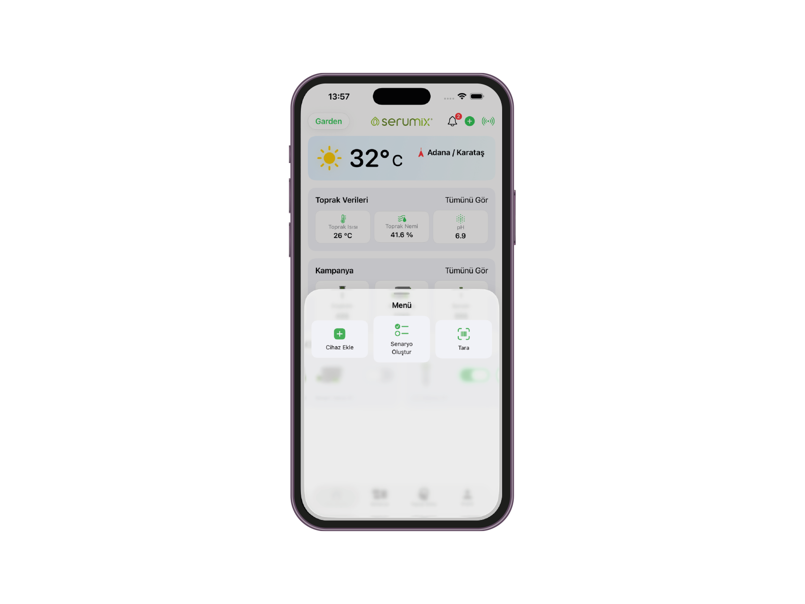 Serumix mobil uygulaması, sulama, gübreleme ve bitki sağlığı yönetimini cep telefonunuzdan gerçek zamanlı olarak kontrol etmenizi sağlar. Tüm donanım ürünleriyle entegre çalışır ve kullanıcıya kolay, hızlı ve sezgisel bir yönetim deneyimi sunar.