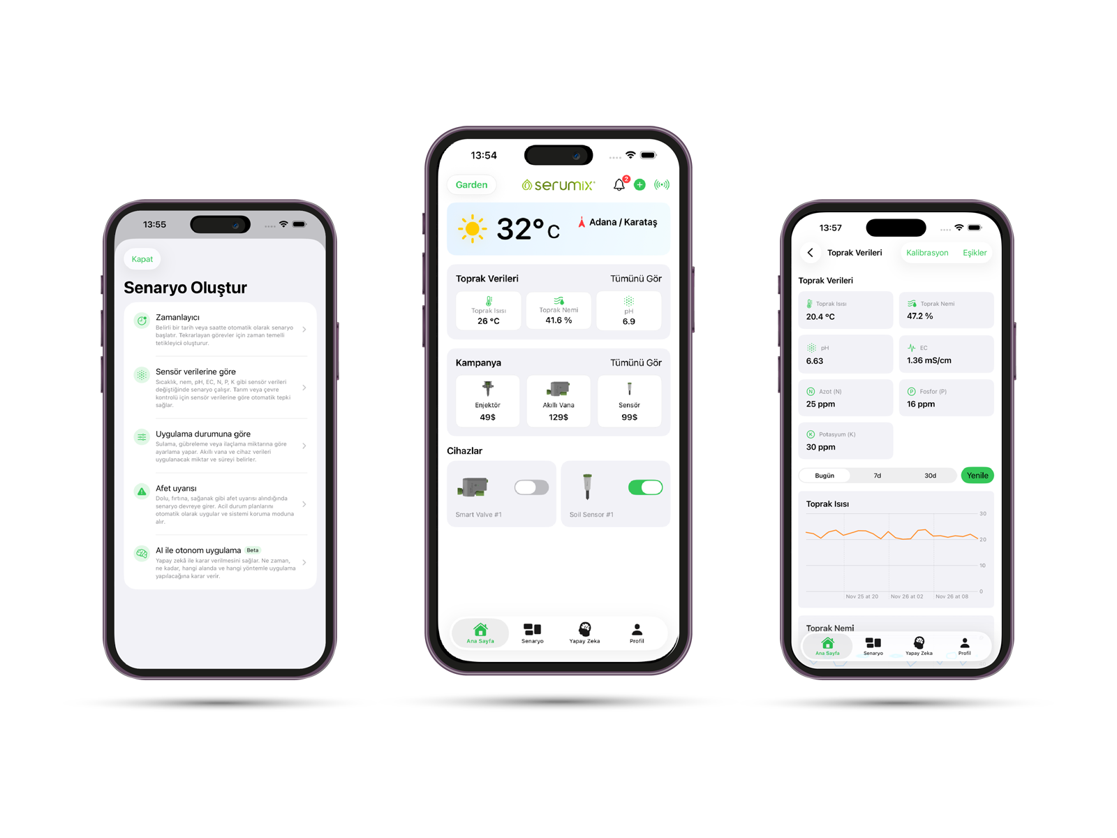 Serumix yazılım platformu; sensör verilerini analiz eden, otomasyon senaryolarını yöneten ve AI destekli karar önerileri sunan akıllı bir yönetim merkezidir. Sensörlerden gelen verileri toplar, analiz eder ve akıllı sulama/gübreleme senaryolarını otomatik olarak yönetmenizi sağlar. Mobil uygulama ve web paneli üzerinden bahçenizin, seranızın veya tarlanızın tüm süreçlerini gerçek zamanlı olarak takip edebilir, gerekli işlemleri tek dokunuşla başlatabilirsiniz.