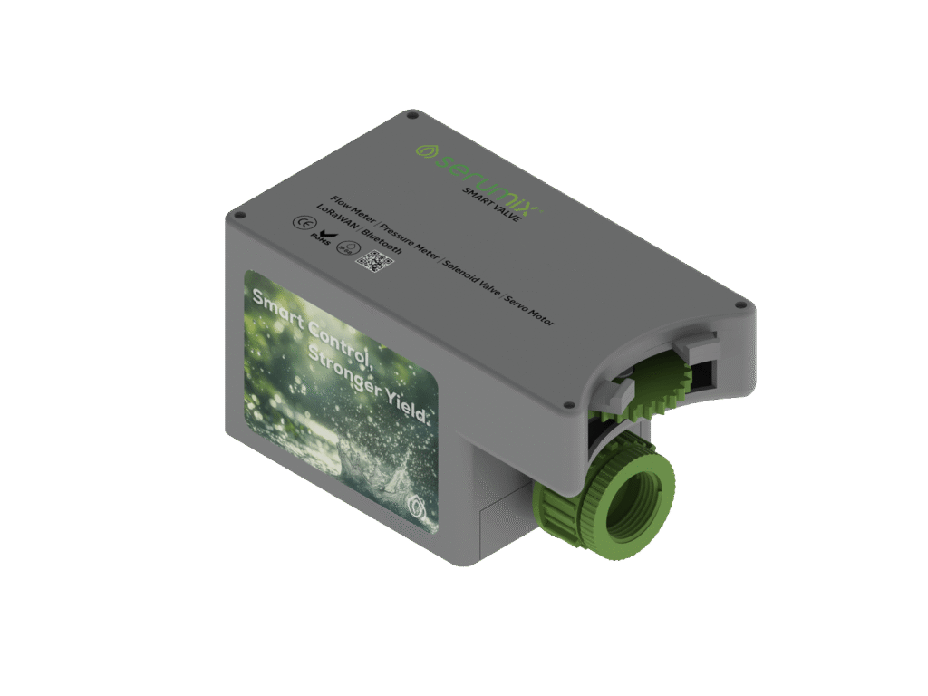 Debi sensörü, basınç sensörü, servo motor ve selenoid vana ile donatılmış akıllı vana, sulama hattı üzerinde tam kontrol sağlar.