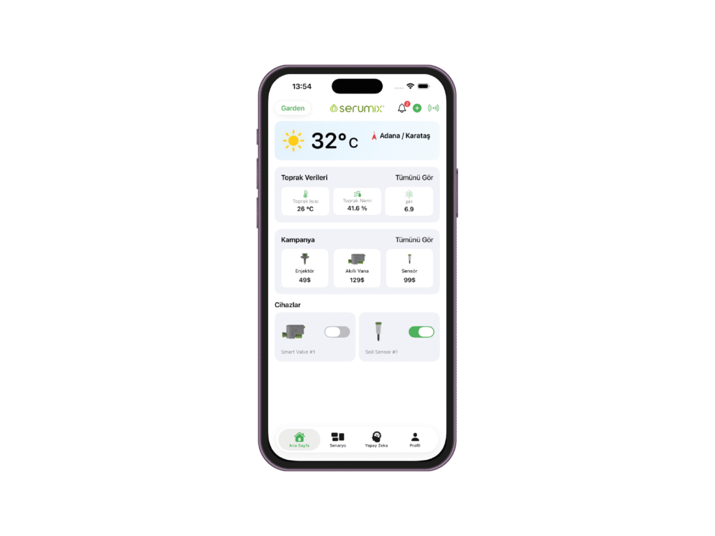 Serumix; toprak sensörleri, akıllı vana ve yapay zekâ ile sulama, gübreleme ve bitki sağlığını otomatik yöneten entegre bir tarım çözümüdür. Bitkinin ihtiyacını analiz eder, doğru zamanda ve doğru miktarda işlemi uygular.