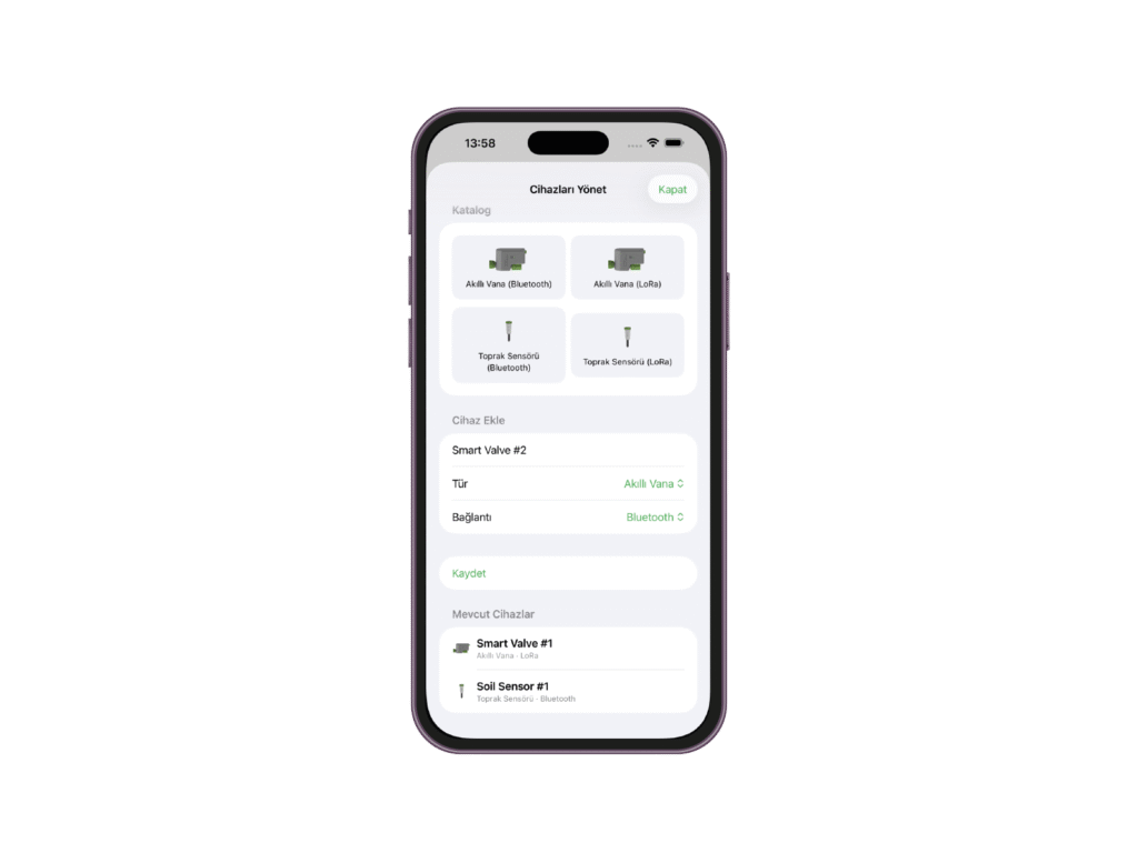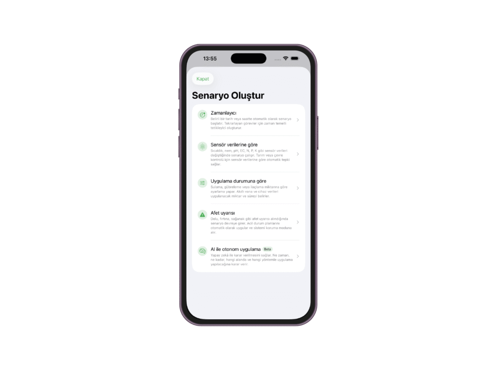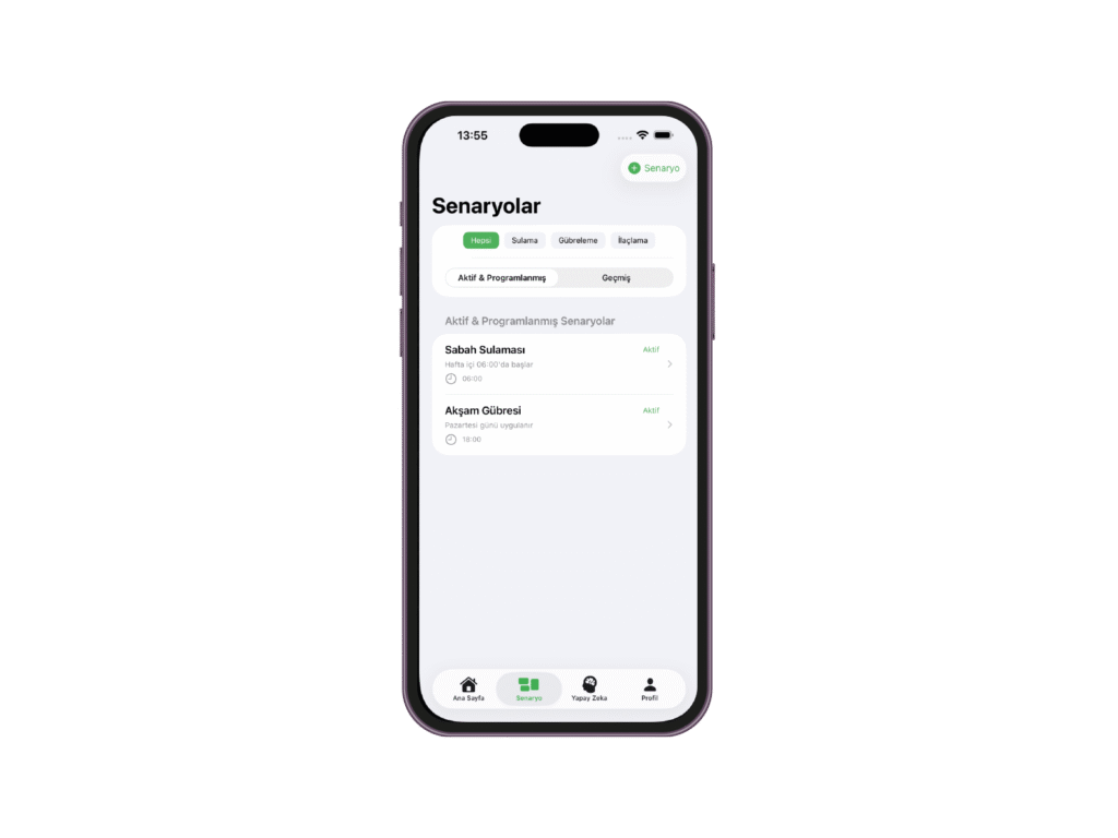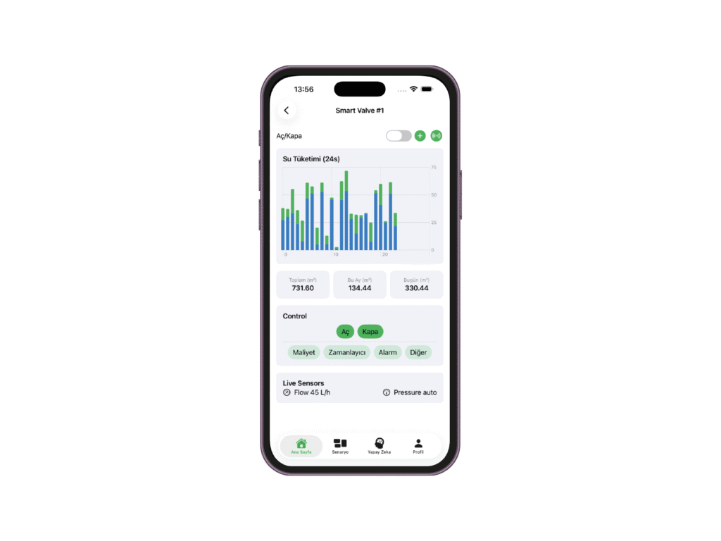 Sensör ve yapay zekâ verilerine göre sulama otomatik başlar veya durur. Bitki tam ihtiyacı kadar su alır, gereksiz tüketim engellenir.