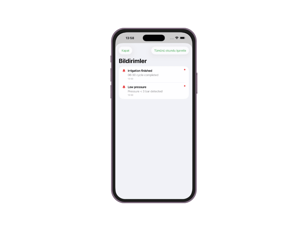 Cihazlar dünyanın her yerinden kontrol edilebilir. Sistem düzenli veya kritik durumlarda bildirim göndererek kullanıcıyı uyarır.