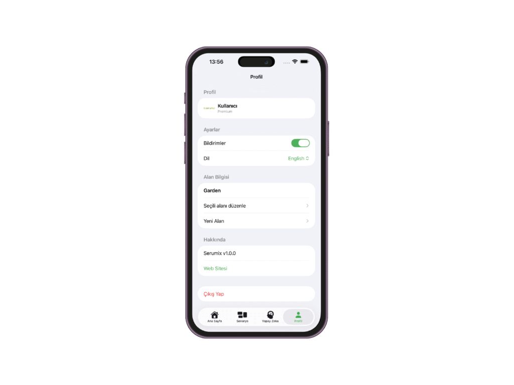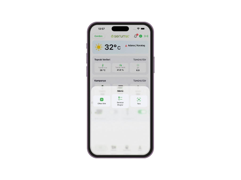 Serumix mobil uygulaması, sulama, gübreleme ve bitki sağlığı yönetimini cep telefonunuzdan gerçek zamanlı olarak kontrol etmenizi sağlar. Tüm donanım ürünleriyle entegre çalışır ve kullanıcıya kolay, hızlı ve sezgisel bir yönetim deneyimi sunar.