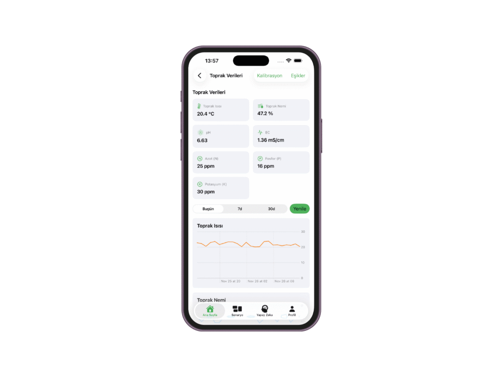 Toprak sensörleri; ısı, nem, EC, pH ve NPK değerlerini 7/24 ölçerek bitki ihtiyacını anlık olarak belirler.